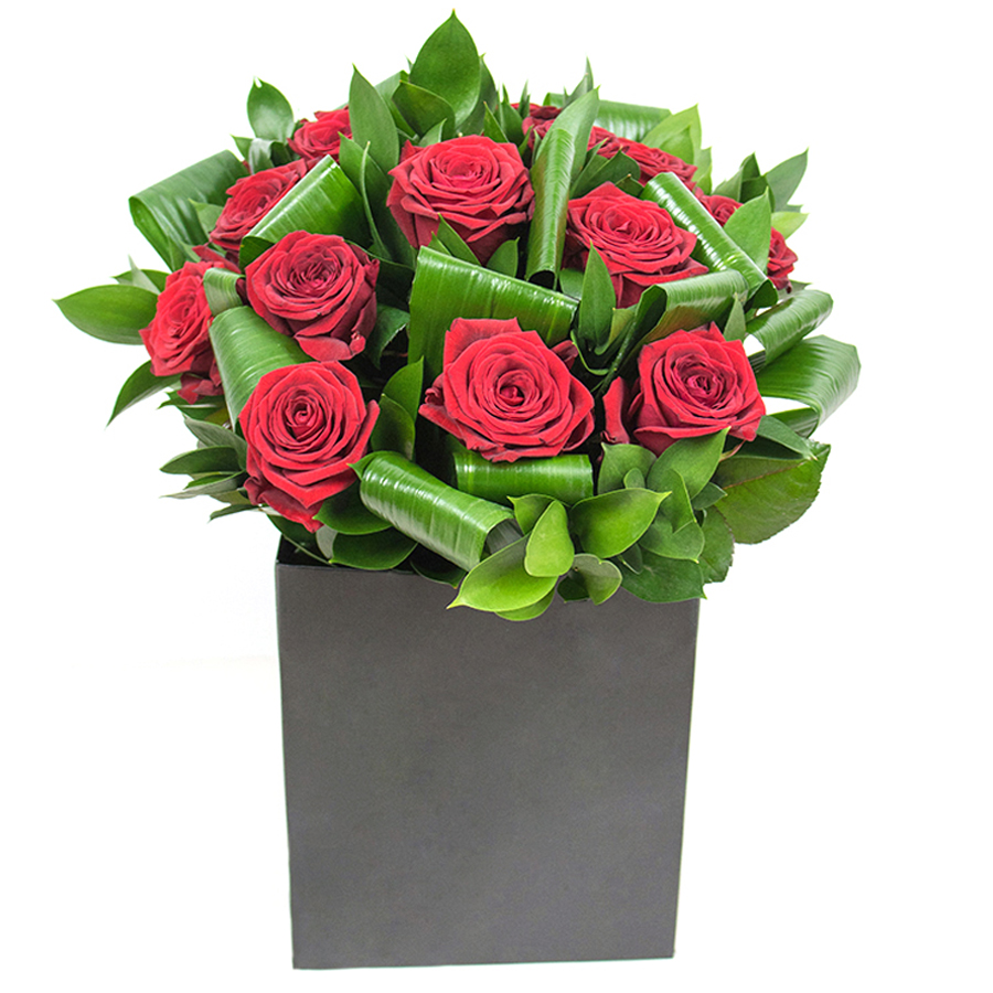 Our sophisticated red rose bouquet features an elegant mix of aspidistra leaves and ruscus, creating a visually stunning and unique floral arrangement. Perfect for adding a touch of luxury to any space.